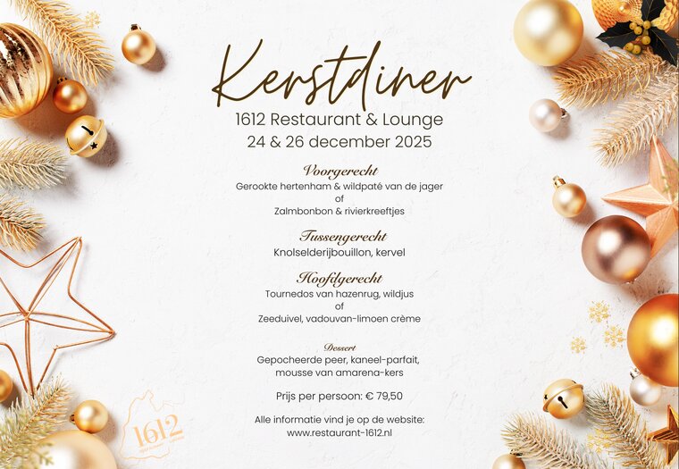 Geniet samen met familie of vrienden van een bijzondere kerstbrunch of een culinaire kerstavond op 24 en 26 december. Uiteraard op de gastvrije wijze die je gewend bent bij 1612.